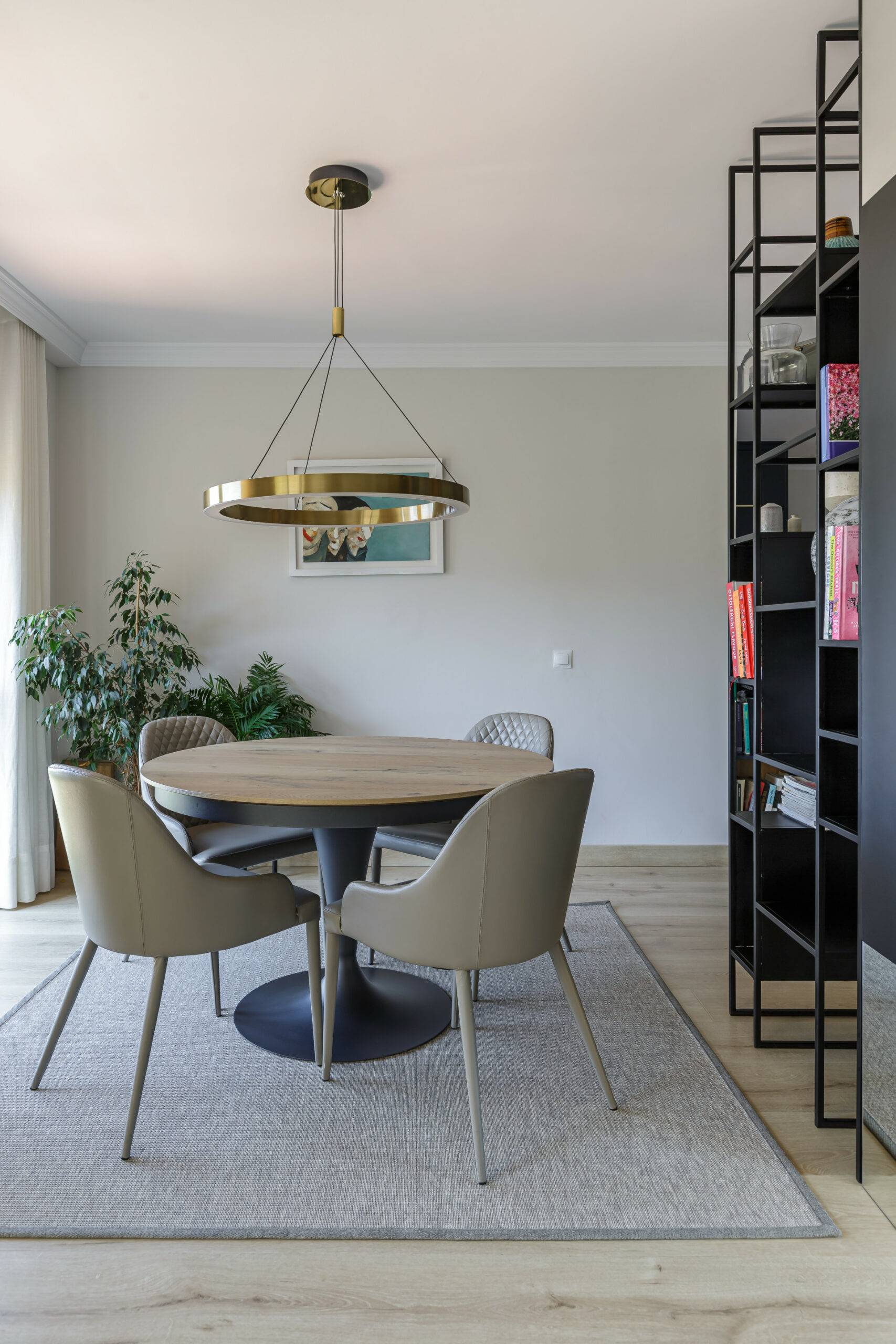 Now the pillar becomes functional; it creates this cosy dining area which is close to the kitchen and separated from the kids, who may be watching something sitting on the sofas. We selected Eclipse as the perfect table for the space, a round table that seats 4 or 5 comfortably and extends to sit 6 to 8 guests.