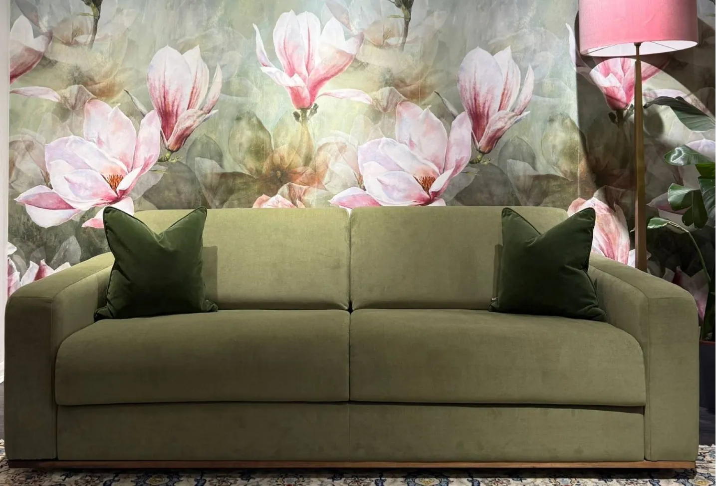 This Sofa bed its covered in super easy to clean Atlantis Chenille fabric in earthy green colour. Walnut plinth