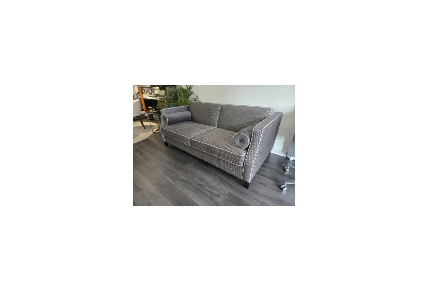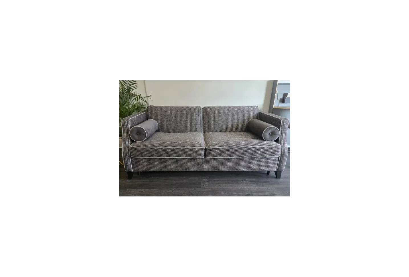 Medium Paris Sofa Bed (3 seater) in a luxurious weave Surat Grey Seal, with slim arms, round bolsters and luxury pocket sprung mattress and finished with black feet.