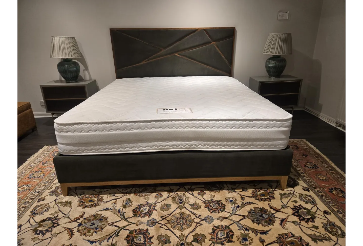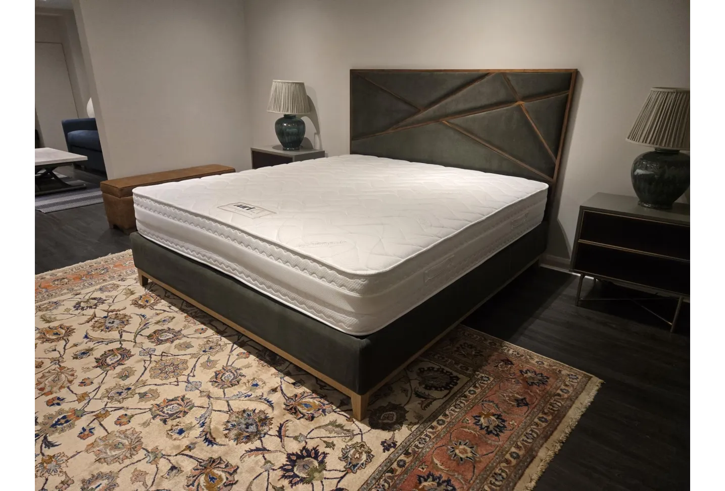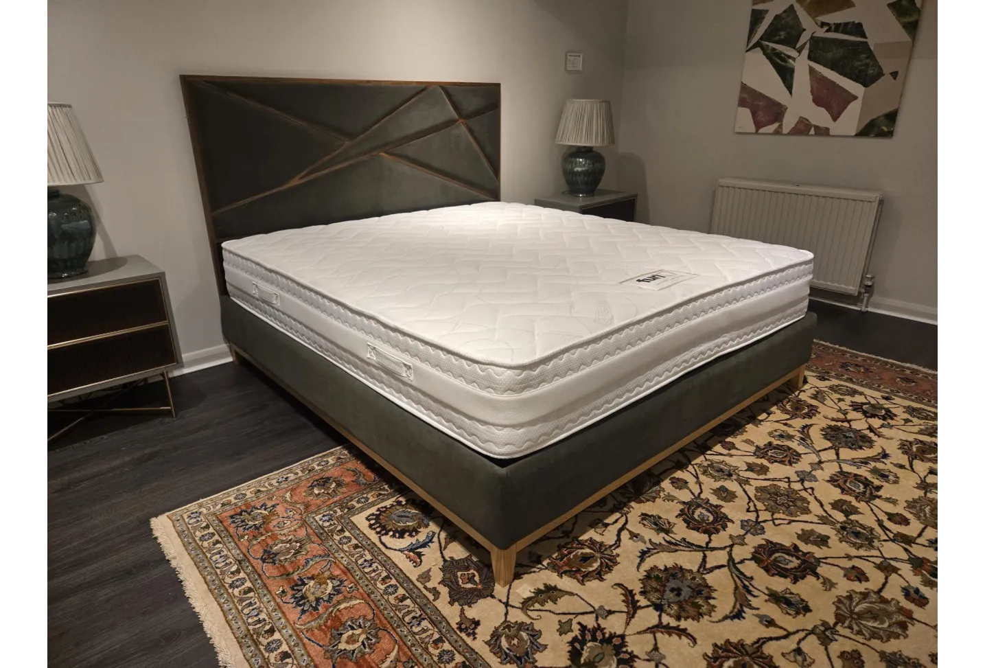 Illusion super king storage bed made in Easy Clean Smooth Velvet with Abstract headboard finished with walnut wooden plinth and feet offer 33 cm of storage depth.