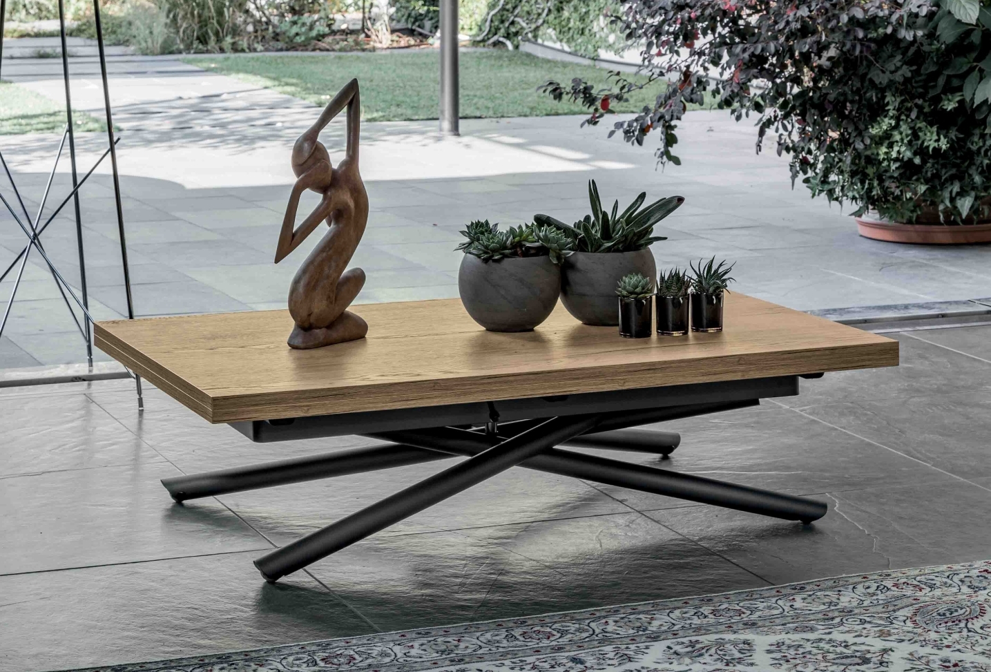 This height-adjustable table is designed to move precisely between everyday coffee table use and full dining height via a gas-assisted lifting mechanism that operates smoothly and securely. When required, the top opens out to increase surface area, comfortably accommodating meals, work or entertaining without the need for additional furniture.