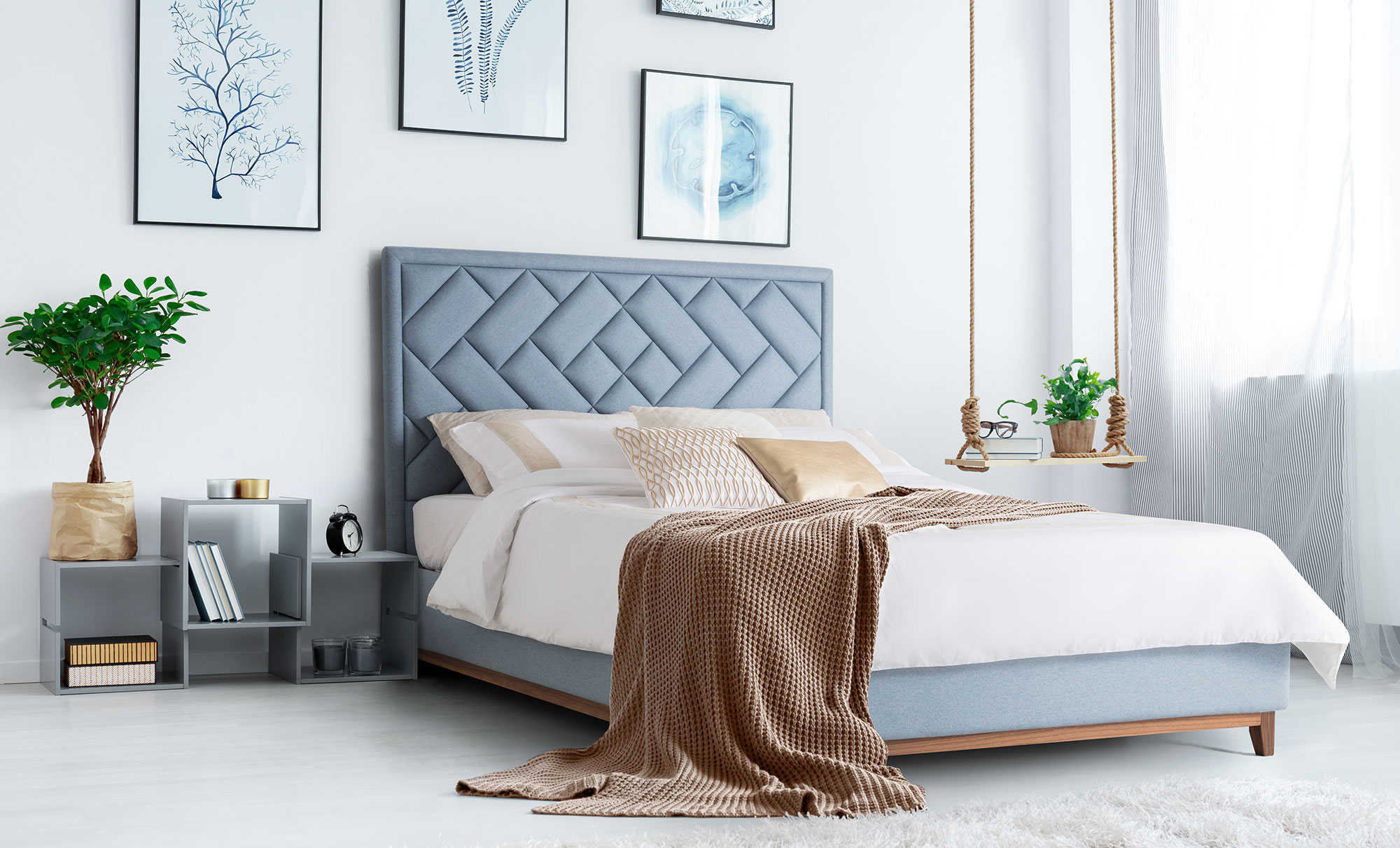 A grid of separately handmade padded panels create this contemporary and timeless headboard.