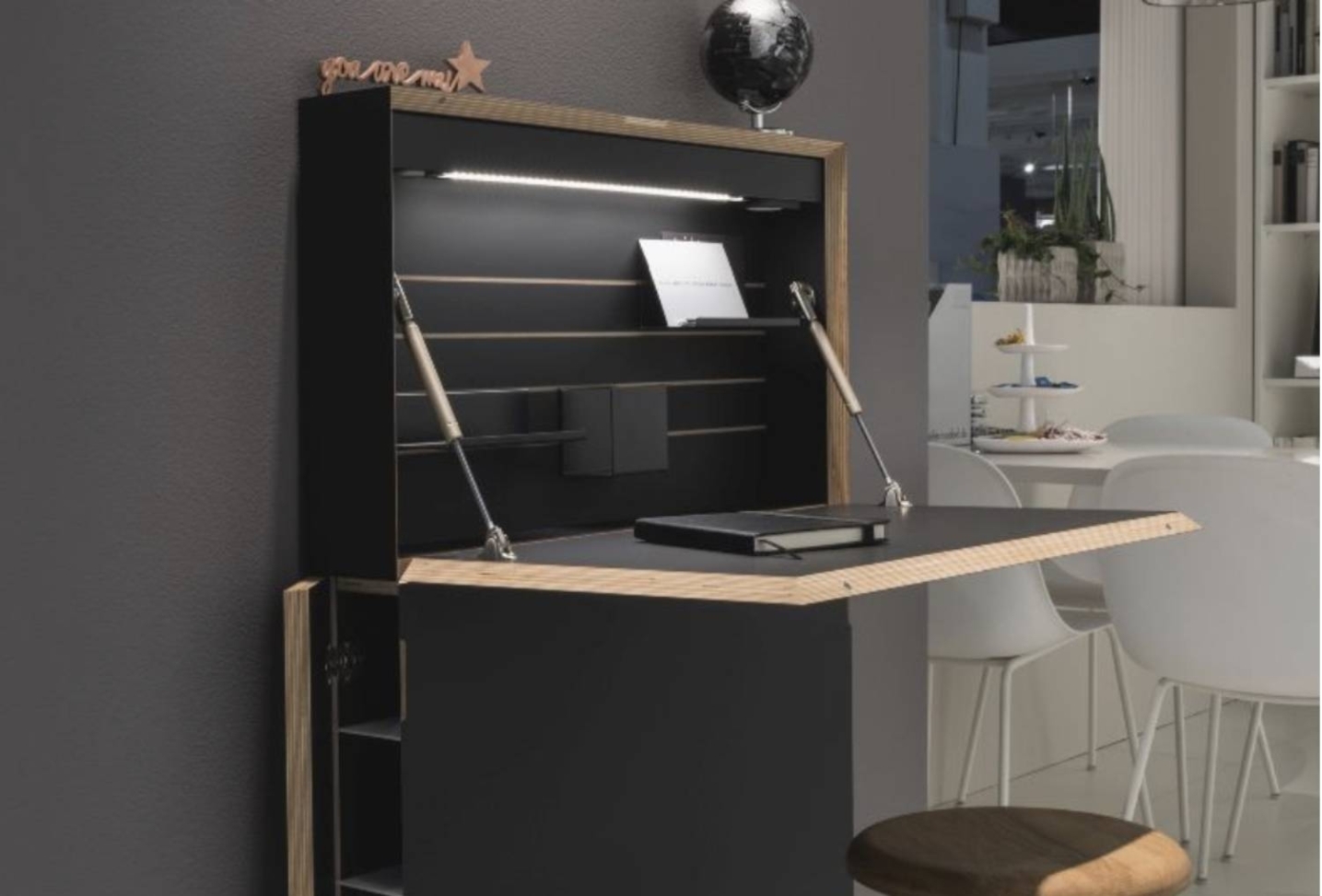 Little Home Office featuring a foldable desk, light, sockets, adjustable shelves and storage.