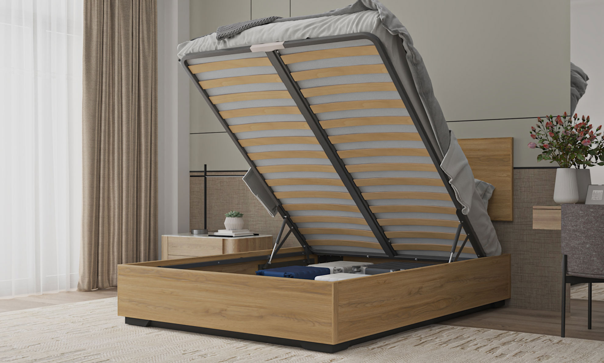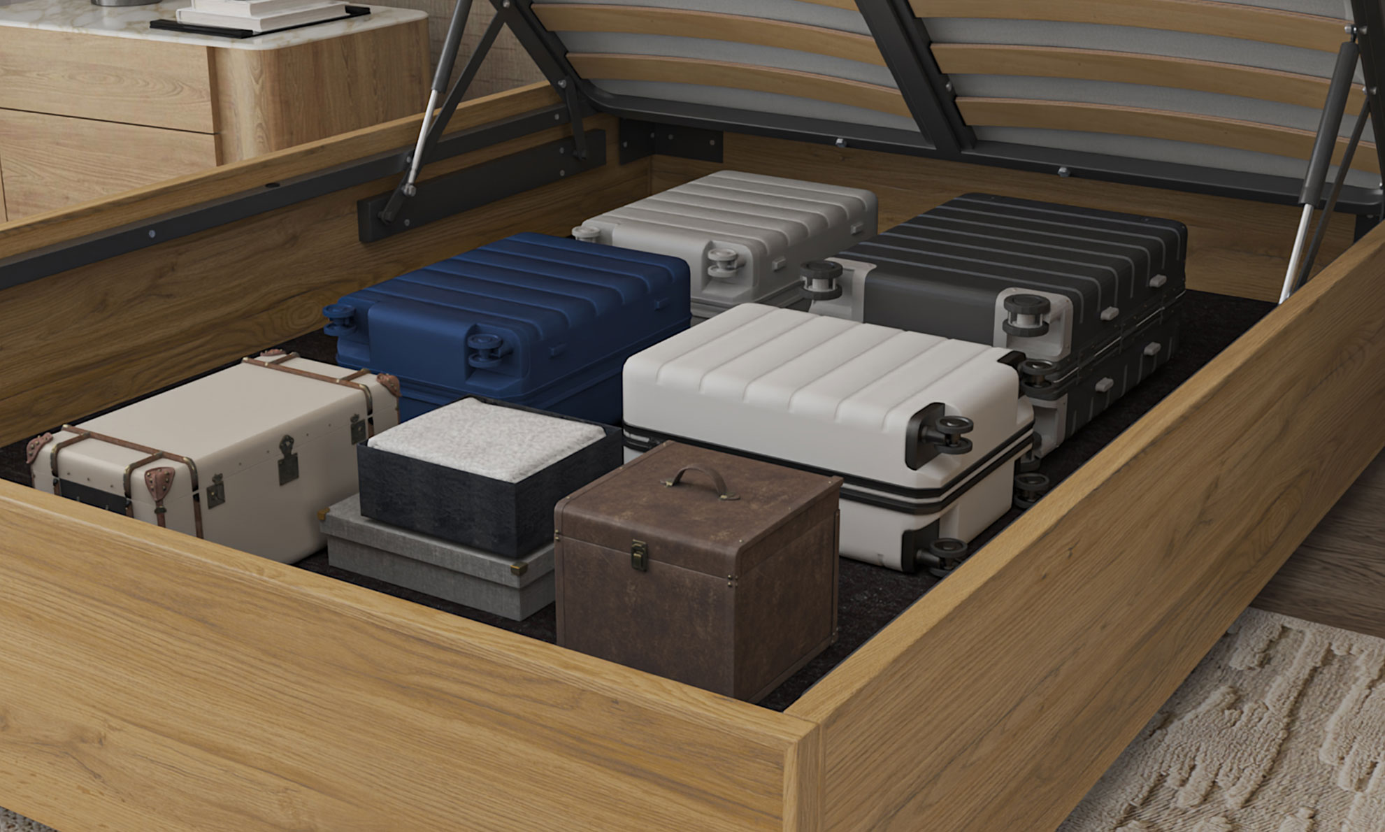 Massive storage in a small footprint. A wood bed you'll never need to clean underneath. Up to 40cm storage depth. Manual or electric mechanism.